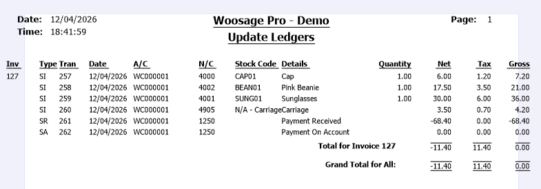 On the next Woosage order processing cycle the payment type is update to Allocate Payment to Invoice and Woosage creates a fee transaction on the fee account associated with the bank account, which is this example it is the same a the bank account (1250). If we the manually post the invoice (Update Ledgers), you can see that transactions are created for the line items and carriage and the payment on account is changed to a payment received.