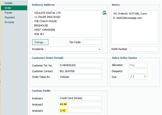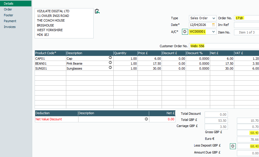 The following sales order was imported to Sage from the website by Woosage.