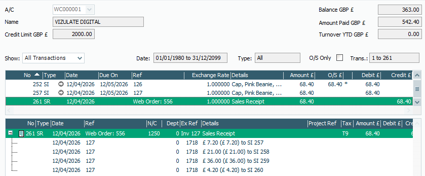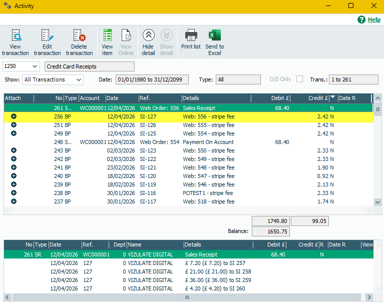 If we examine the bank account (1250) you can see that Woosage has created a fee credit of £2.42 and the payment debit is showing as a sales receipt.