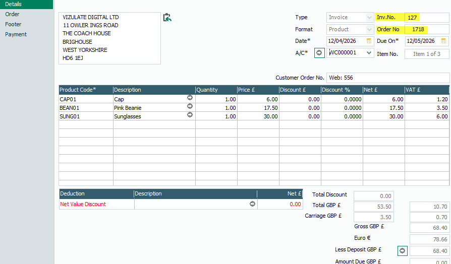 If we now complete (despatch) the sales order and create a sales invoice this creates invoice number 127 (shown below) from order number 1718.