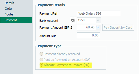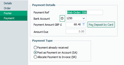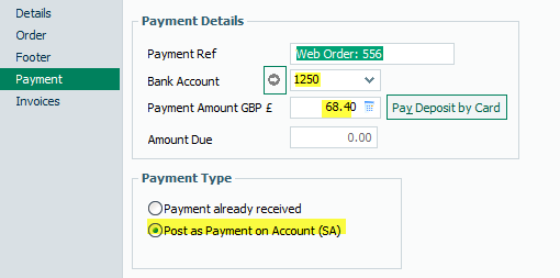 On the Payment tab of the order (shown below) you can see that the customer payment is £68.40 and it is currently showing as a payment on account (SA) as there is no invoice to pay at this stage. Also note the Payment ref is the website order number and the nominated bank account for the Woosage settings is 1250.
