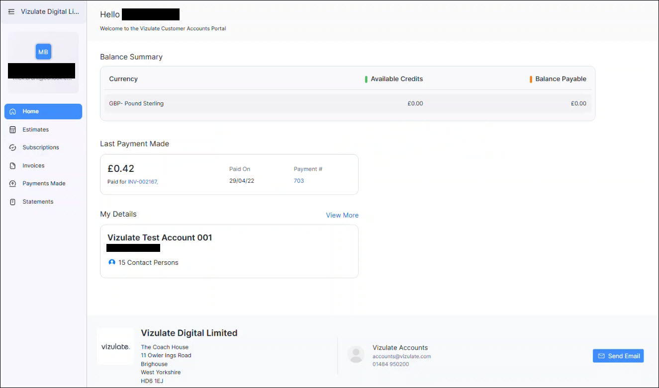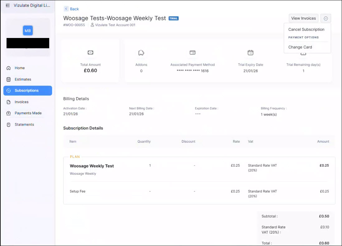 Note: the images below show detail relating to a test account and subscription with personal details redacted.
