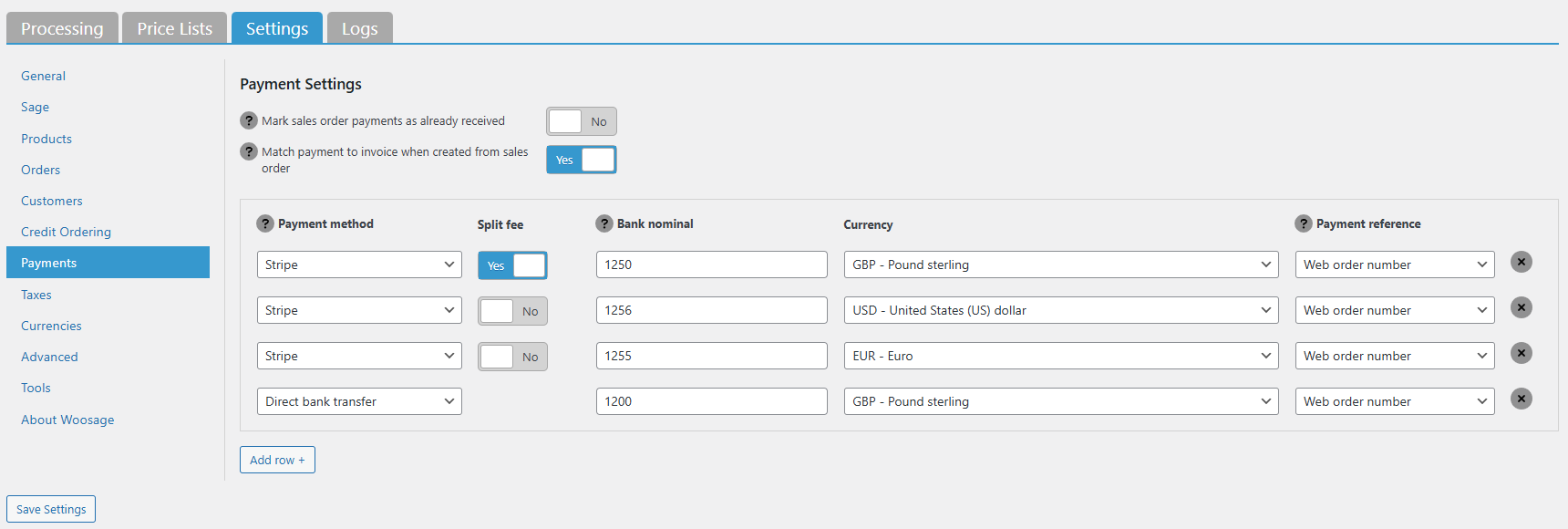 - Click the Add Row + button again to add another payment method (or the same method with a different currency, if your payment method supports it)